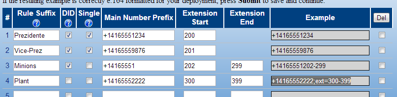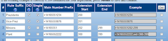 You may notice additional options for extension entry than before. Firstly, I've upped the extension limit from 10 to 20. Secondly, I've added options to create your own rule suffixes for extension ranges. So, if you're creating an extension range for your London, UK head office, you can assign a suffix like "HeadOffice", which will make the resulting normalization/routing rules use UK-London-20-HeadOffice, instead of the default UK-London-20-Internal-1.You may also notice an additional checkbox column for "Single". Sometimes, you may have users with their own DID, but maps to an internal extension that doesn't hold any relation to the DID.