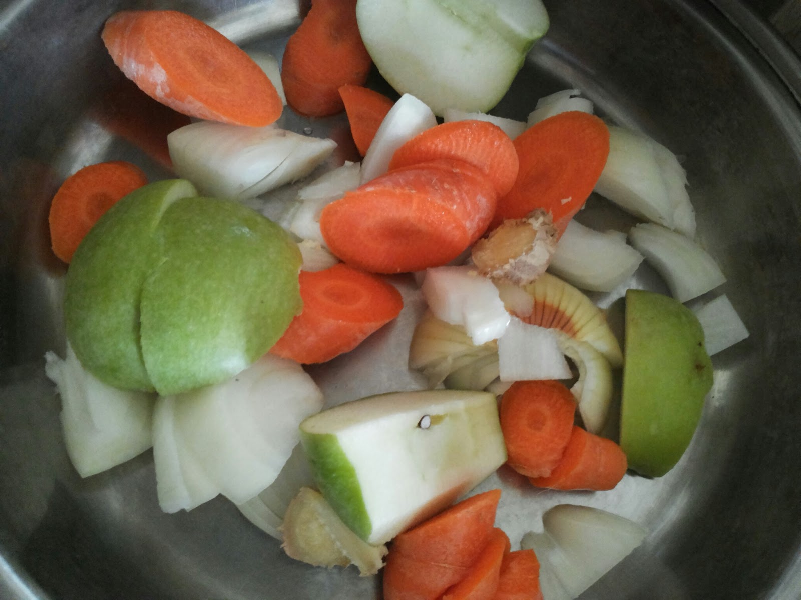 This was cooked in a large covered frying pan. I added the cabbage after the carrots were partially cooked. The ginger gives it a nice "tang," perfect on a scorcher of a day.