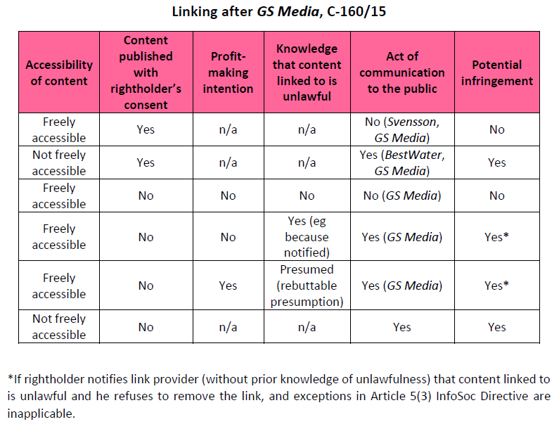 Further to this week's GS Media decision [here and here], here's an updated version of my 'linking table' [check out also this useful tool prepared and shared by Martin Husovec the same day of the GS Media decision]: